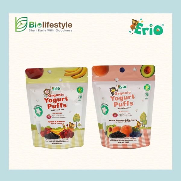 Our Erio Organic Black Rice Puffs & Yogurt Puffs are made from organic & natural ingredients that are sweetened with organic apple juice, fortified with calcium and Vitamin B1.No added junk! Great finger foods for babies 6+ months!