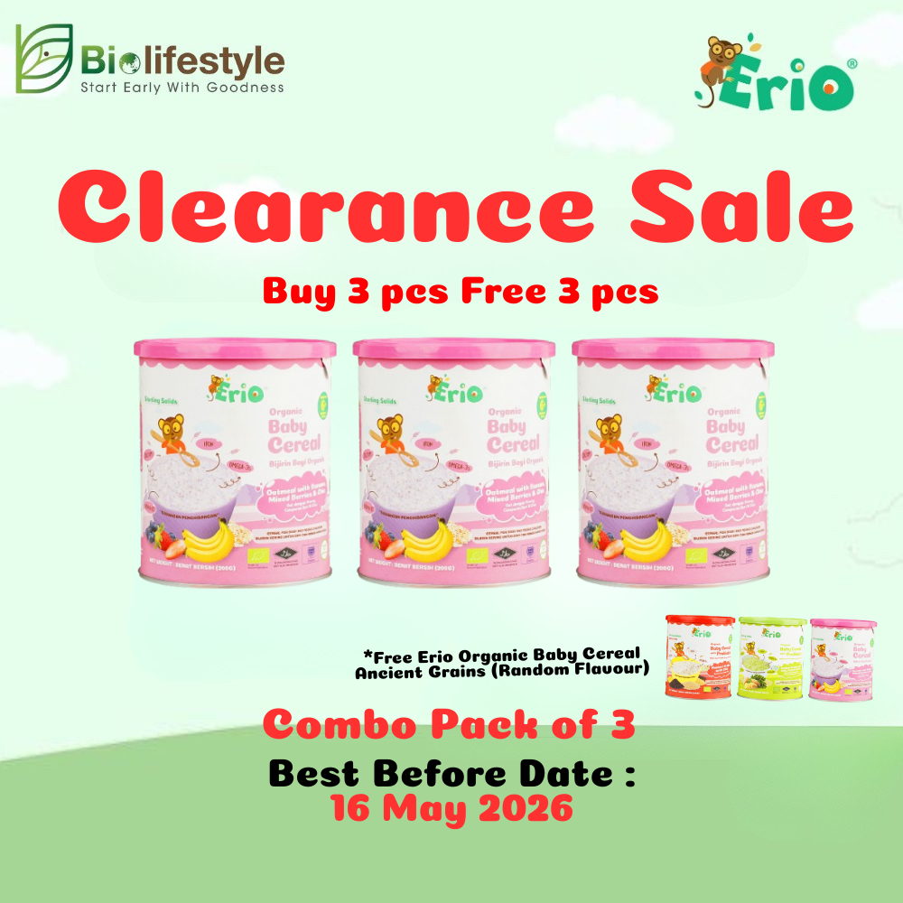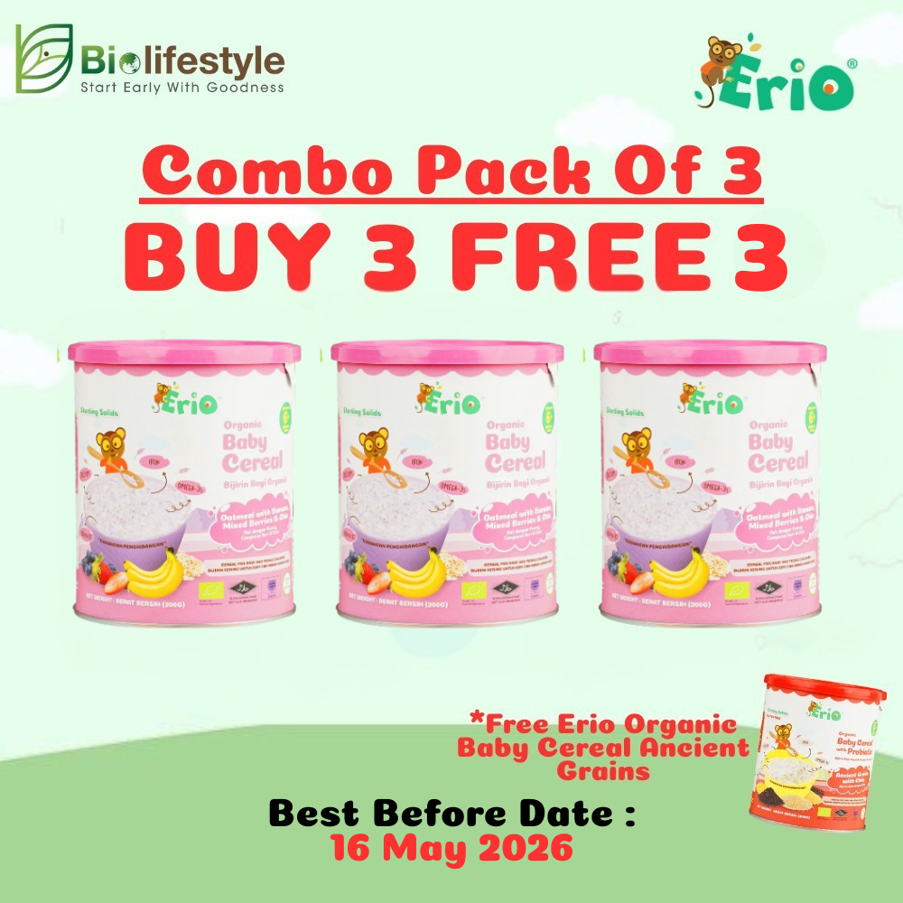 *Clearance Sale* (Combo Pack Of 3) Erio Organic Baby Cereal Oatmeal with Banana Mixed Berry & Chia (200g x 3) – Free 3 Pcs